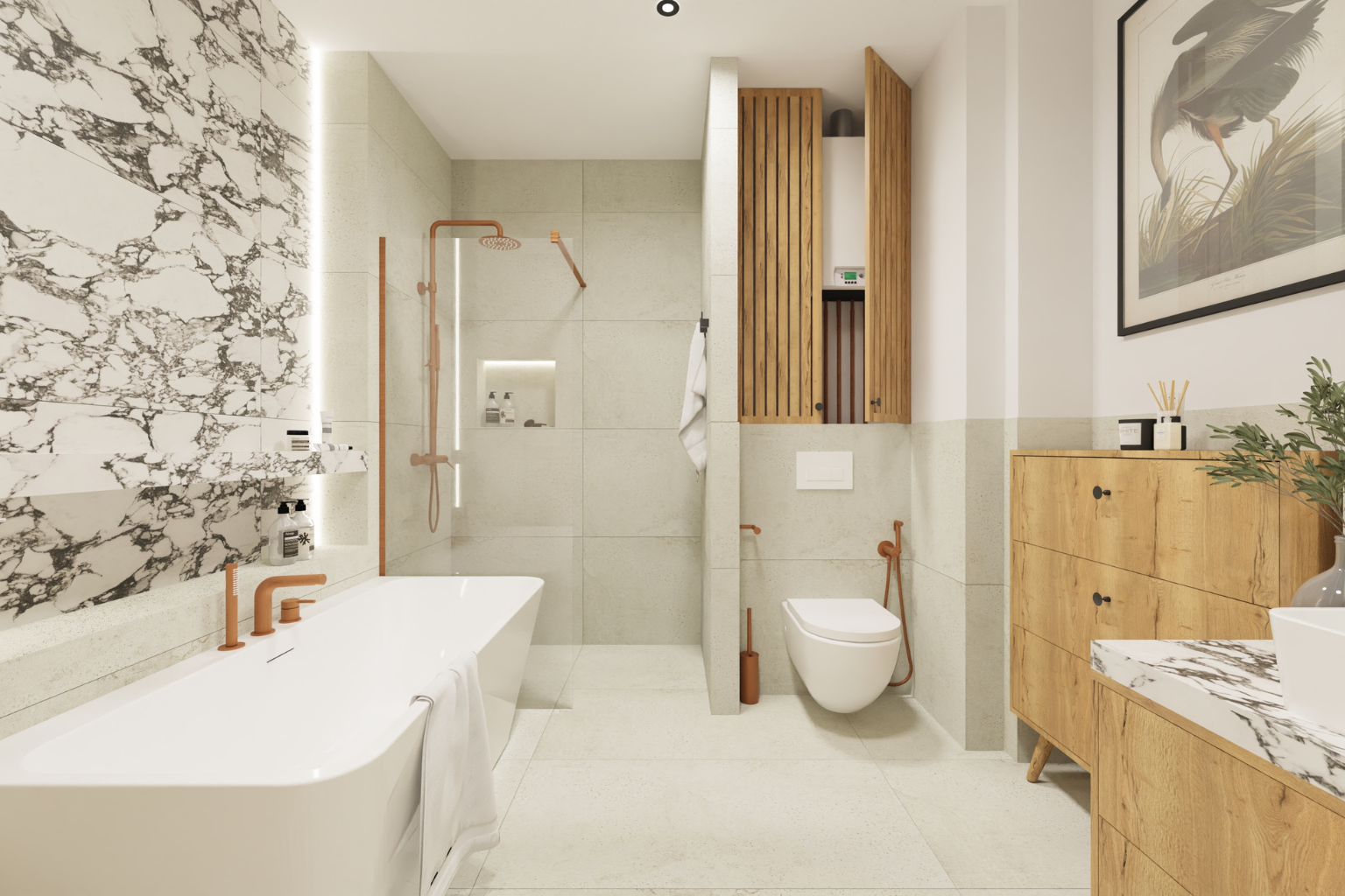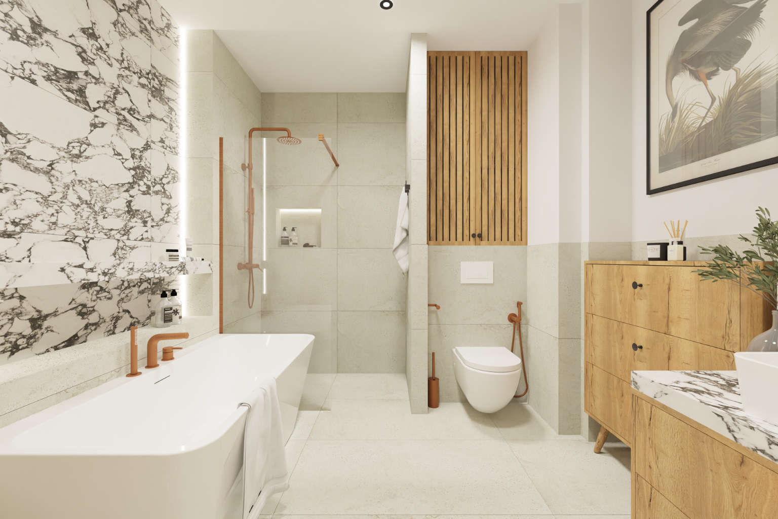 - Szczegółowe kłady ścian łazienki oraz kuchni